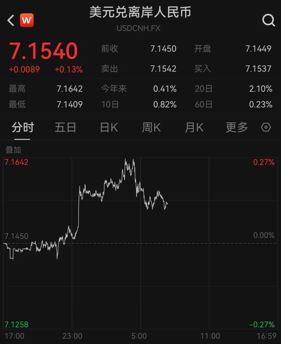 在富时中国A50指数期货拉升的同时,离岸人民币兑美元短线也出现拉涨,1个小时内上涨约100点,现报7.1540。不过,从日内涨跌幅来看,今日离岸人民币兑美元仍是微跌。