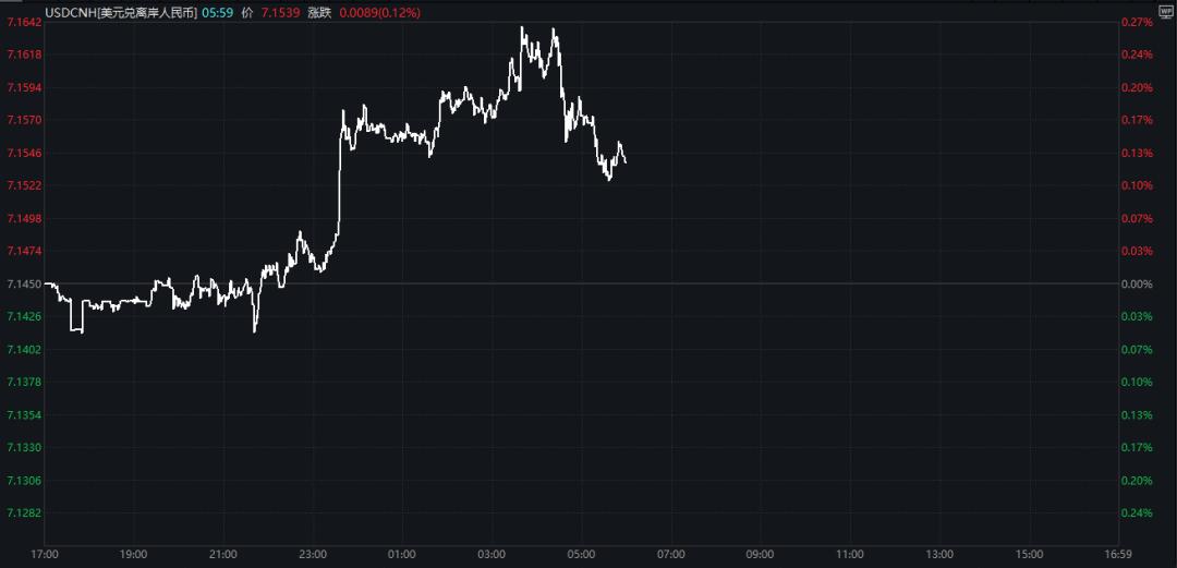 在富时中国A50指数期货拉升的同时,离岸人民币兑美元短线也出现拉涨,1个小时内上涨约100点,现报7.1539。不过,从日内涨跌幅来看,今日离岸人民币兑美元仍是微跌。