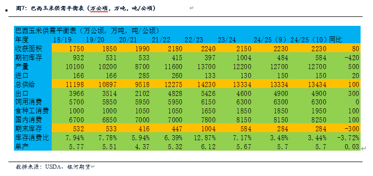 10月报告美玉米收获面积维持不变,单产继续上调。24/25年美玉米成本线480美分/蒲附近,美玉米面积9070万英亩左右,低于去年的9460万英亩。单产由9月的183.6蒲/英亩上调到10月的183.8蒲/英亩,今年美玉米优良率较高,收获进度加快,截止10月29日,美玉米收割率81%,高于去年68%。