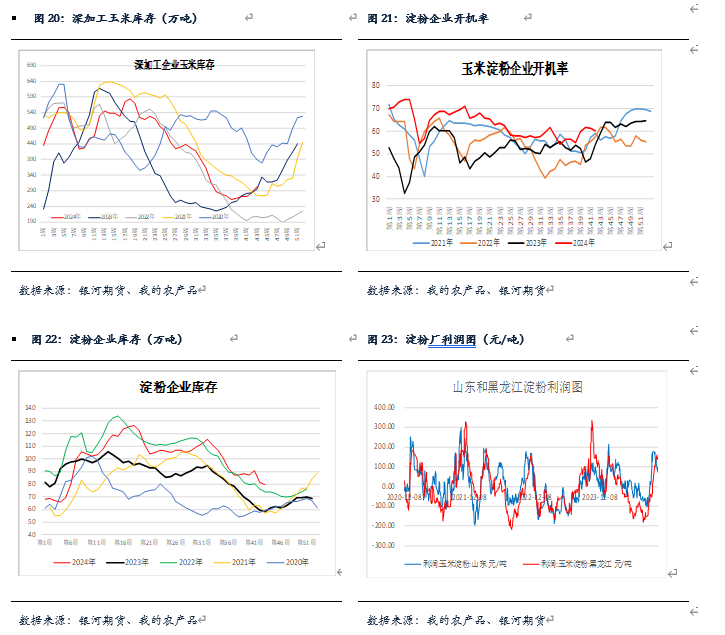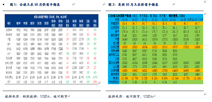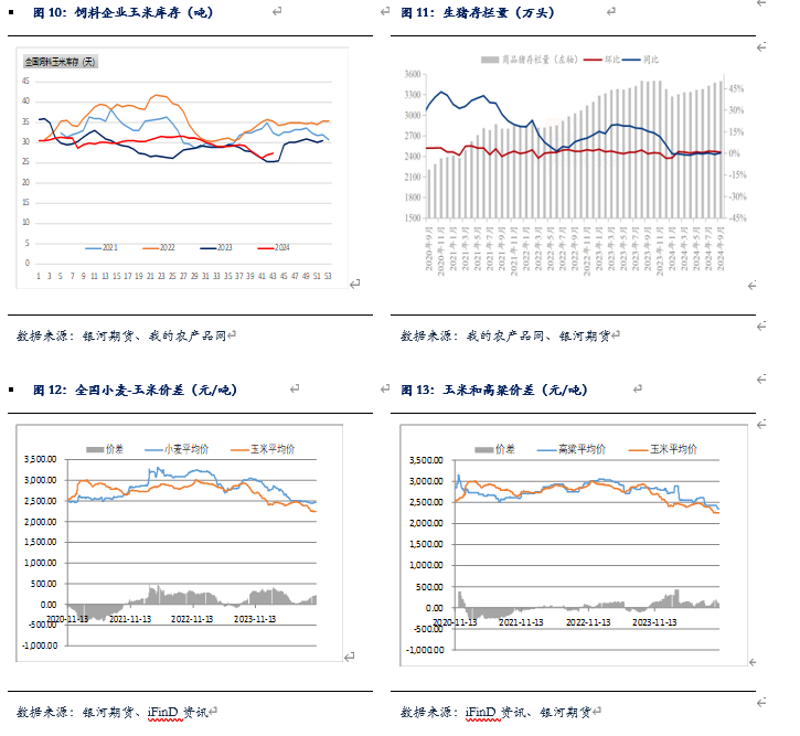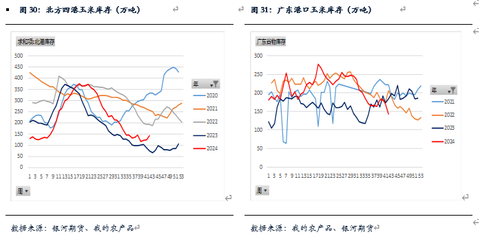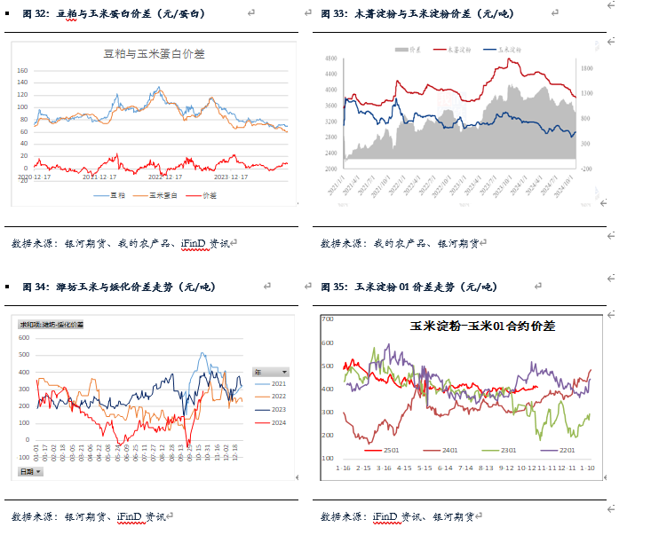 24年全球供应仍充足,10月USDA报告上调单产,但美玉米需求增加,净多开始增加,美玉米底部基本确立,后期仍有反弹空间。新季国内玉米减产,进口谷物开始减少,小麦和糙米替代大幅减少,需求缓慢增加,24/25年度玉米供应会偏紧。国内9月底华北玉米大量上市,10月华北玉米反弹,华北玉米底部已经出现,山东东北2050元/吨基本底部,后期会继续反弹。10月东北玉米大量上市,受收储消息影响,东北玉米开始企稳反弹。预计黑龙江1900元/吨以下空间有限。11月东北玉米仍有反弹空间,但考虑到今年收割延后及结转仍较高,元旦之前东北农户仍有卖压,盘面预计仍会窄幅震荡。