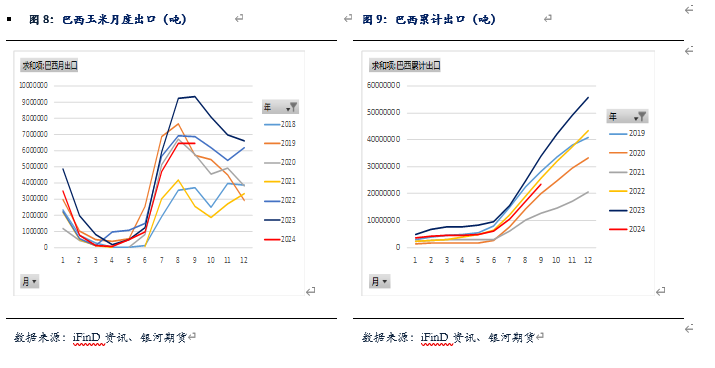 2024年10月USDA报告全球玉米产量略下调,但产量和库销比仍处于高位。24/25年度全球玉米产量预期12.17亿吨,低于去年的12.26亿吨,也低于上月的12.19亿吨。其中饲用玉米消费7.74亿吨,高于去年7.70亿吨,国内总消费12.17亿吨,高于去年的12.14亿吨,预计期末库存3.065亿吨,低于去年的3.127亿吨,库销比25.19%。其中美国产量3.86亿吨,饲用1.47亿吨,食用及工业消费1.74亿吨,出口5906万吨。巴西产量1.27亿吨,饲用6300万吨,出口4900万吨。阿根廷产量5100万吨吨,出口3600万吨。乌克兰产量2620万吨,出口2300万吨。全球供应压力仍较高,但消费仍在增加,库销比下降,压力开始减轻。