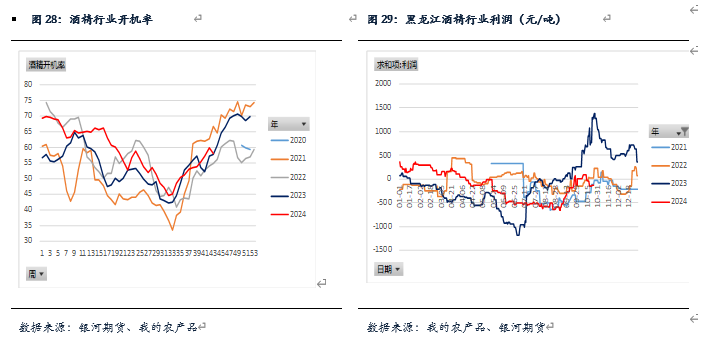 酒精行业,10月由于玉米现货持续下跌,酒精开机率开始上升,酒精利润也在改善,但仍然亏损。一般酒精行业受玉米影响较大,开机率和利润呈现很强的季节性规律,且大部分酒精企业在东北地区,受玉米影响较大。截止10月28日,黑龙江利润为-29元/吨,河南酒精利润为-591元/吨。东北地区收到低价玉米影响,预计利润仍会较高,且开机率仍会增加。
