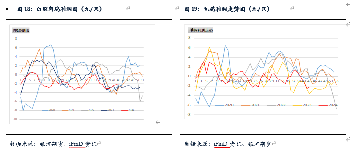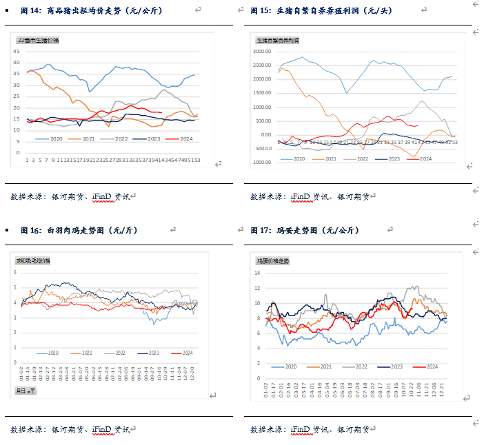 11月是传统养殖旺季,且玉米和豆粕价格处于低位,预计饲料需求会增加。根据中国饲料工业协会数据,2024年9饲料产量2815万吨,环比增1.2%,同比下降4.1%,1-9月饲料产量累计22787万吨,累计同比下降4.3%。前三季度猪料产量10229万吨,同比下降6.8%。蛋禽饲料产量2288万吨,同比下降5.9%。肉禽产量7053万吨,同比增长0.5%,肉鸡饲料同比下降0.4%,肉鸭饲料同比增长1.0%。工业协会的数据在生猪和肉禽方面和我们预测类似,但蛋禽数据和我们的相差很大。蛋禽今年存栏较高,预计饲料产量同比会增加一些。造成蛋禽相差很大的原因主要是工业协会蛋禽饲料统计数据覆盖比例相对较低,且蛋禽利润好,散户自配比例较大。11月是传统养殖旺季,需求会增加,预计环比仍会增加。生猪方面,生猪存在仍在上升,且生猪利润较好,预计生猪饲料需求仍在增长。根据钢联数据,123家样本企业商品猪9月存栏3499.71万头,环比上涨0.7%,同比增0.24%。截止10月29日,自繁自养利润为474元/头,外购仔猪利润149元/头。生猪利润继续下滑,存栏增加,预计11月存栏相对稳定,饲料需求也会相对稳定。10月肉鸡养殖利润增加,截止10月27日,肉鸡养殖利润0.32元/只。截止10月27日,鸡蛋养殖成本3.39元/斤,养殖利润1.35元/斤。