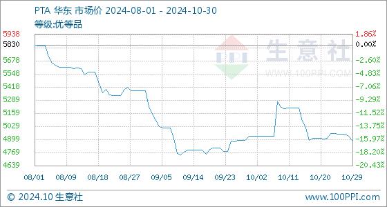 10月30日,生意社PTA基准价为4881.00元/吨,与本月初(4928.00元/吨)相比,下降了-0.95%。