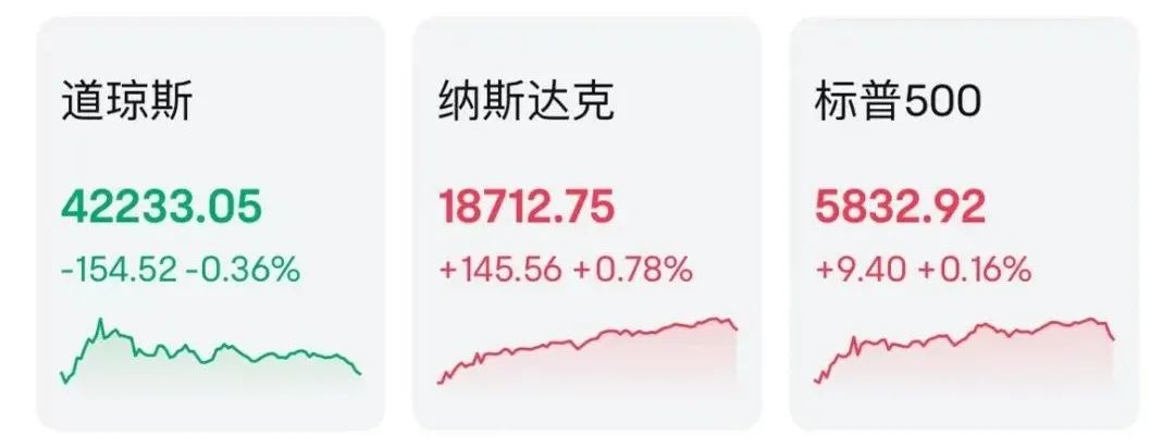 截至收盘,道琼斯指数收跌0.36%,报42233.05点;标普500指数收涨0.16%,报5832.92点;纳斯达克综合指数收涨0.78%,报18712.75点,创历史新高。