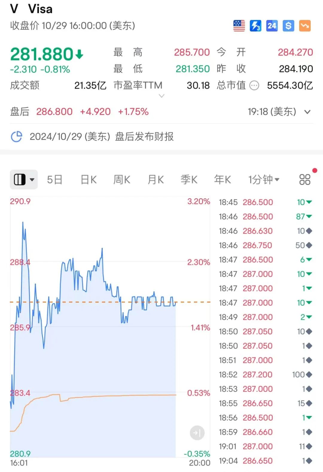 值得关注的是,美东时间10月29日,美国支付巨头Visa表示,考虑裁员大约1400名员工。Visa的股价收跌0.81%,最新总市值5554.3亿美元,但公布财报后盘后一度涨近3%。