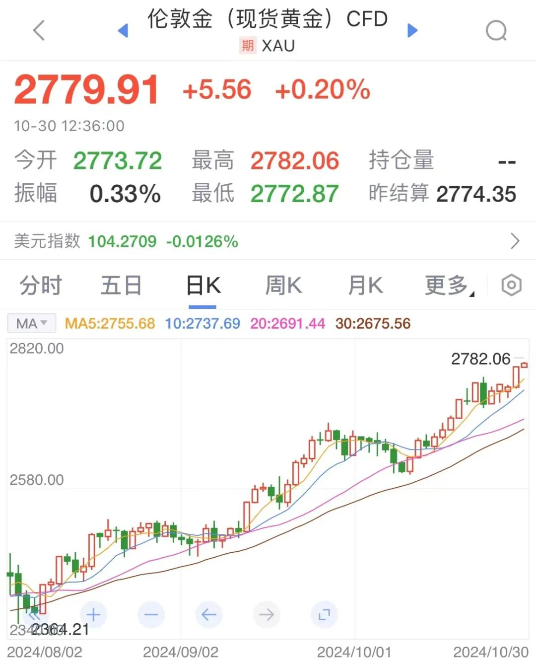 美国人将前往投票站选举新一任总统,由于多数关键州的民调结果势均力敌,不确定性继续在金融市场蔓延,促使投资者将黄金作为可靠的避险资产。截至发稿时,今日伦敦金价格盘中高点2782.06美元/盎司,刷新历史纪录的同时进一步靠近2800美元/盎司大关。