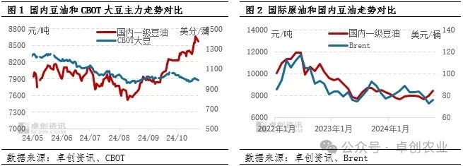 豆油是主要的生物燃料原料之一,所以国际原油的变化对国内豆油价格影响较大。国际大豆价格以CBOT大豆价格为行业风向标,所以CBOT大豆的价格变化直接影响了国内进口大豆成本,进而影响其下游产品豆油市场走势。从图1中可以看出,自今年9月以来国内豆油和CBOT大豆主力走势出现分叉,CBOT大豆收盘价呈现回落走势,而国内豆油整体上涨。从近两个月来两者的走势对比可以看出,国内豆油市场来自成本端大豆的偏空影响有所减弱。但在原油价格下滑的拖累下,给生物燃料原料的豆油市场带来回落压力,在此背景下,成本端价格下跌也对豆油市场的上涨产生一定拖拽压力,限制了豆油持续走高。10月28日芝加哥期货交易所(CBOT)大豆期货收盘下跌,基准期约收低1.1%,国内一级豆油现货在28日回落93元/吨后于29日延续偏弱整理的走势。