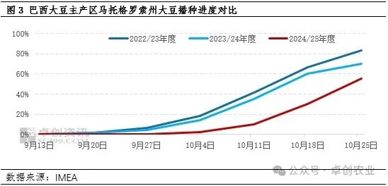 巴西大豆产区播种进度加快:2024/25年度巴西大豆产区播种进展缓慢,但随着巴西大豆产区天气情况改善,播种进度明显提高,马托格罗索州农业经济研究所(IMEA)10月25日数据显示,当周马托格罗索州的大豆种植面积猛增,达到预计总面积的55.73%。另外据CONAB数据显示,截至10月27日,巴西大豆播种率为37.0%,上周为17.6%,去年同期为40.0%。