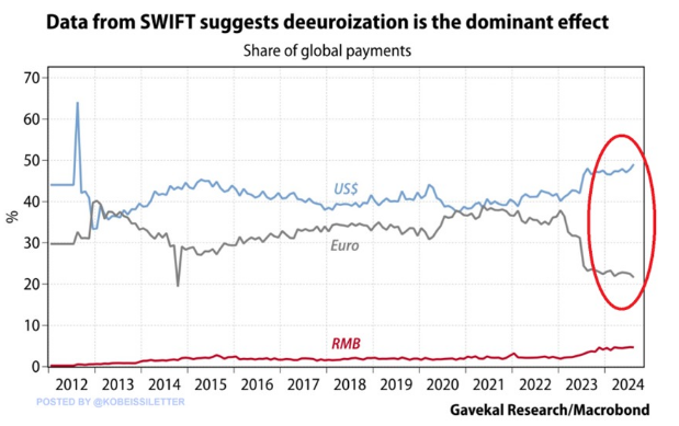 他们补充说:“在过去两年中,美元在国际支付交易中的使用量增长了9个百分点。与此同时,欧元的份额从39%暴跌至21%,为十年来的最低水平。人民币的使用量从2023年的2%增加到目前的5%。欧元到底怎么了?”