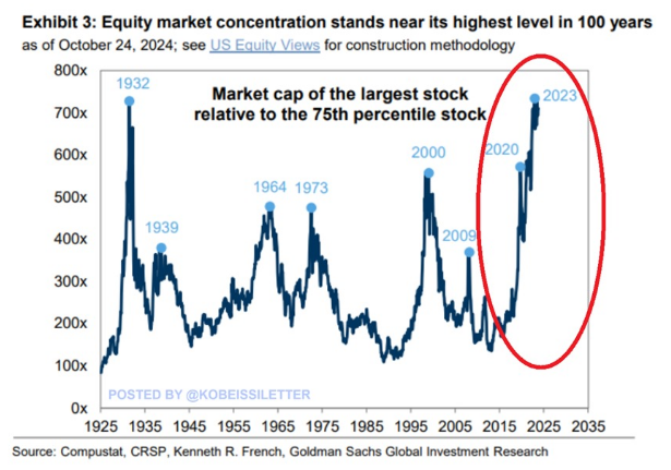 另一个令人担忧的迹象是,股市屡创新高的同时,集中度水平也在不断提高,目前的情况接近大萧条时期的市场状况。