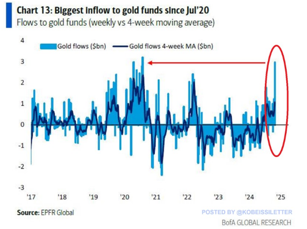 Kobeissi Letter称:“上周黄金基金流入约30亿美元,为纪录第二高,这是过去几周平均数量的三倍多。”