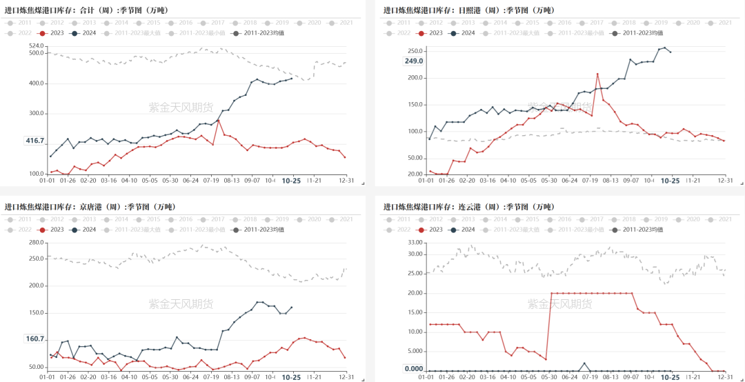 进口炼焦煤港口库存416.7万吨,周环比+6.14万吨;港口库存压力仍大。