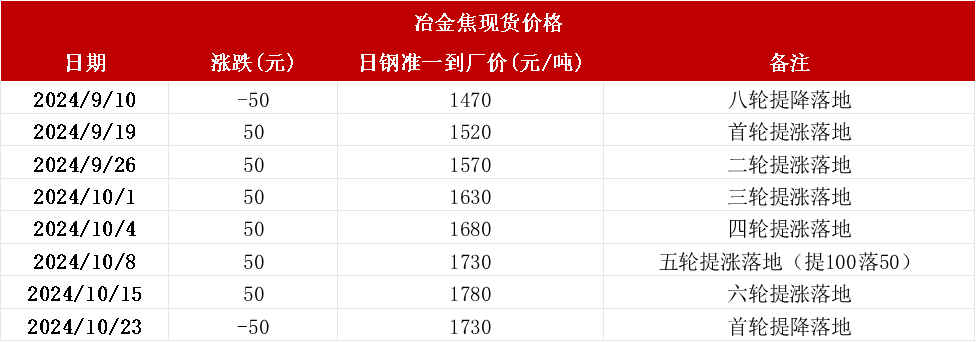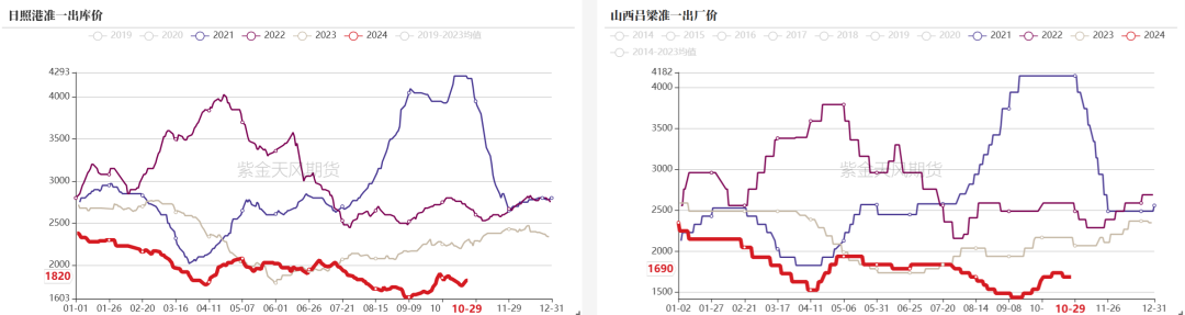 焦炭上周提降一轮50-55元/吨,后续仍有降价预期;准一级焦炭港口现货震荡偏弱运行,报价1820元/吨附近,周环比-10元/吨,首轮提降后山西准一级湿熄焦报价1650-1690元/吨。