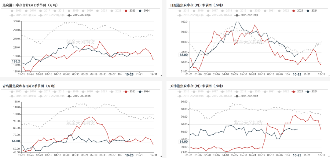 焦炭港口库存186.2万吨,周环比+5.97万吨。