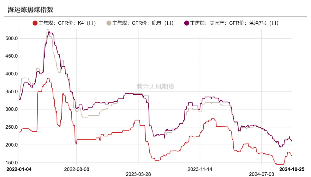 海运煤方面,近期海运煤价格优势收窄,下游采购偏谨慎,目前澳洲一线焦煤远成交价FOB205.7美金,周环比+7美元/吨;俄罗斯K4主焦最新CFR报价170美元/吨,周环比持平。
