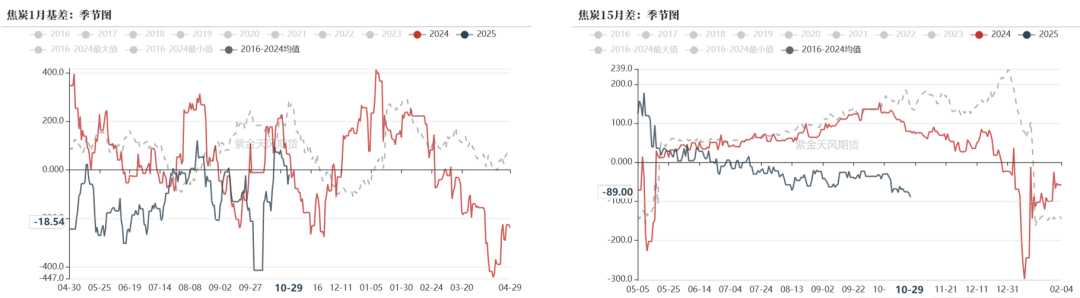 焦煤近期震荡走势,基差小幅走弱,盘面在平水附近;月差方面继续反套格局。