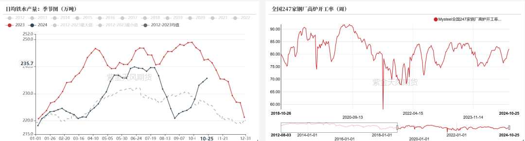 247家钢厂铁水日均产量235.7万吨,周环比+1.3万吨;247家钢厂高炉开工率82.14%,周环比+0.46%;