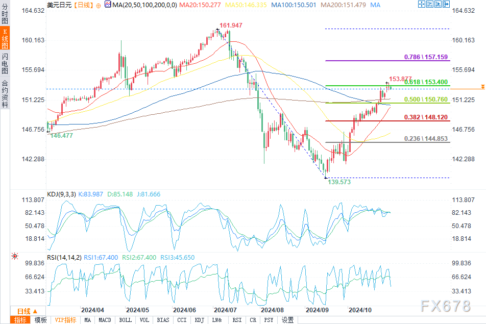 美元/日元未能在收盘时未能守住从161.94至139.56的跌势的61.8%斐波纳契回撤位,但在153.90创下三个月的看涨峰值。