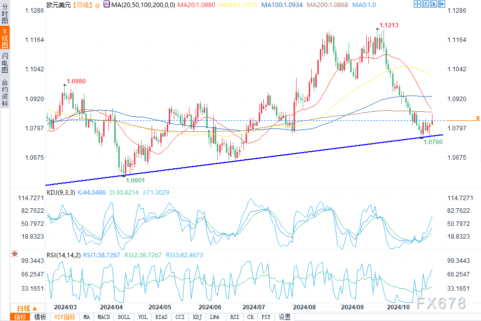欧元/美元正在从连接2023年10月至2024年10月连续低点的趋势线反弹。