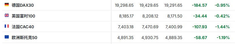2. 截至发稿,德国DAX指数跌0.95%,英国富时100指数跌0.42%,法国CAC40指数跌1.44%,欧洲斯托克50指数跌1.19%。