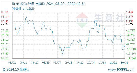 10月31日,生意社Brent原油基准价为70.73美元/桶,与本月初(71.70美元/桶)相比,下降了-1.35%。