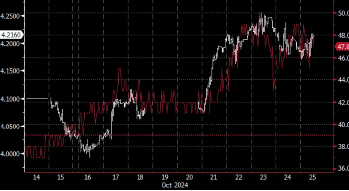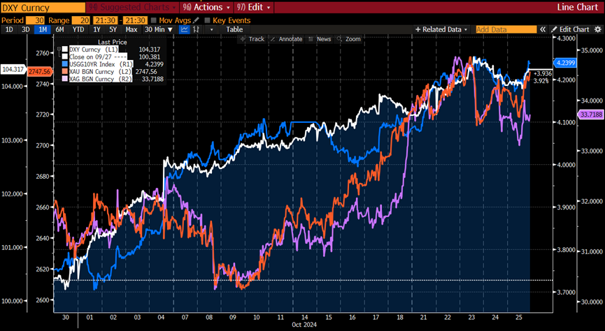 但是值得注意的是,这种情形下的回调是技术型的,因为美元指数上行和收益率提升具有经济数据支撑,并不是完全基于选举。而一旦选举出现其他结果,比如哈里斯胜选,那么美元指数可能调整幅度更大一些。