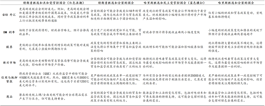 图2:海外投行关于不同大选结果情景对资产价格影响的一致预期(放大浏览)