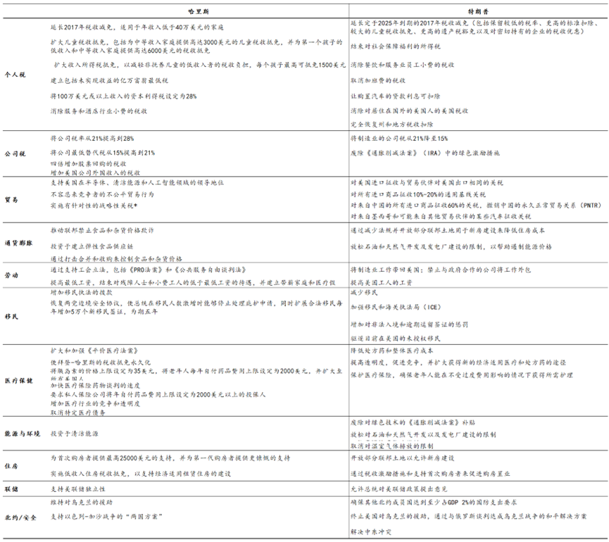 先看最直接的两党候选人竞选主推政策差异,我们可以粗略的来讲哈里斯的竞选主推策略为“萧规曹随“型,她的政策组合更类似本届民主党任期内拜登政府策略的加码和深化,也和2020年大选时民主党政策组合的“精神”相一致。
