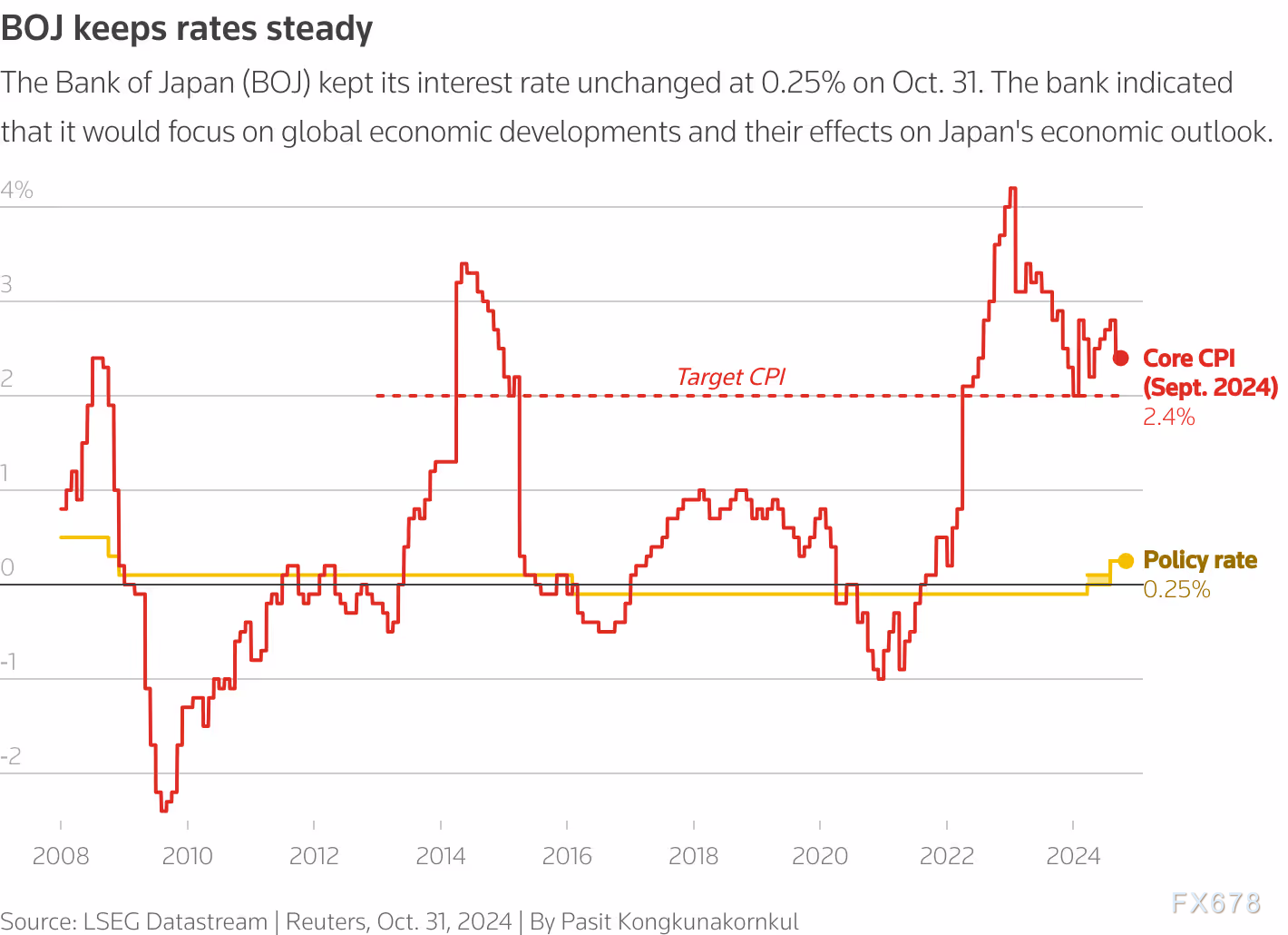 日本央行在3月份结束了负利率,并在7月份将短期利率上调至0.25%,认为日本正在朝着可持续实现2%的通胀目标迈进。