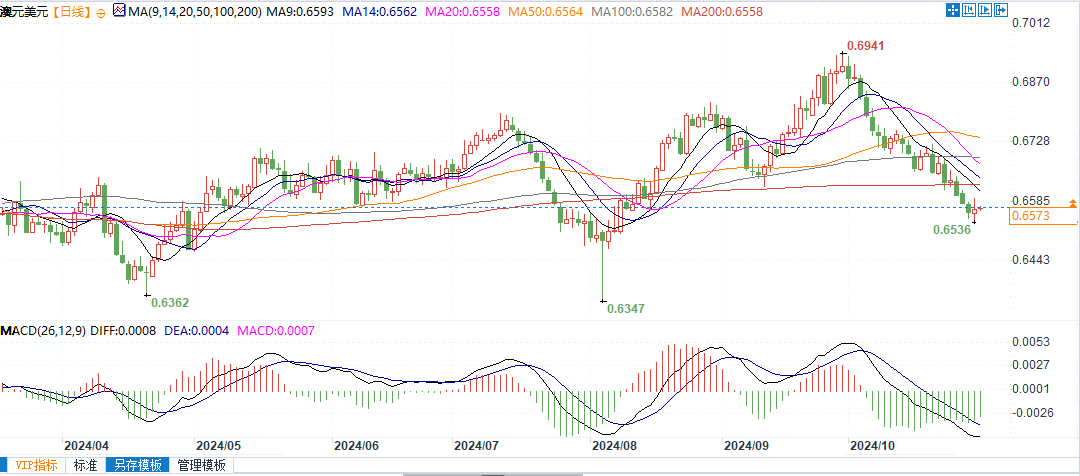 北京时间10月31日14:11,澳元兑美元报0.6573/74
