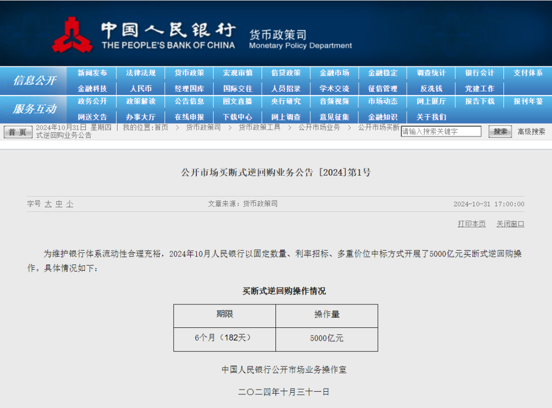 10月31日,央行官网发布首个买断式逆回购交易公告,当月开展6个月期买断式逆回购操作5000亿元,实现了工具创设后的高效落地。