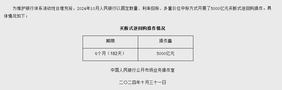 中国人民银行10月31日发布公开市场买断式逆回购业务公告[2024]第1号。公告显示,为维护银行体系流动性合理充裕,2024年10月人民银行以固定数量、利率招标、多重价位中标方式开展了5000亿元买断式逆回购操作,期限为6个月(182天)。