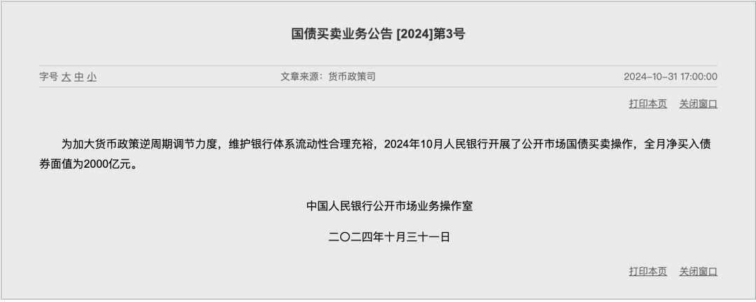 同日,央行公告称,为加大货币政策逆周期调节力度,维护银行体系流动性合理充裕,2024年10月中国人民银行开展了公开市场国债买卖操作,全月净买入债券面值为2000亿元。