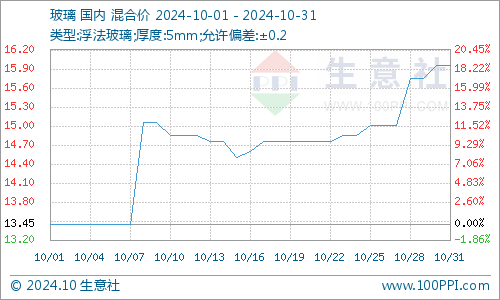 据生意社商品分析系统显示,下游玻璃行情延续上涨。10月28至31日,玻璃价格从15.75元/平方米涨至15.95元/平方米相比,涨幅1.27%。玻璃市场下游需求较好,厂家出货顺畅,市场去库明显,玻璃价格坚挺上调,周内行情强势运行。