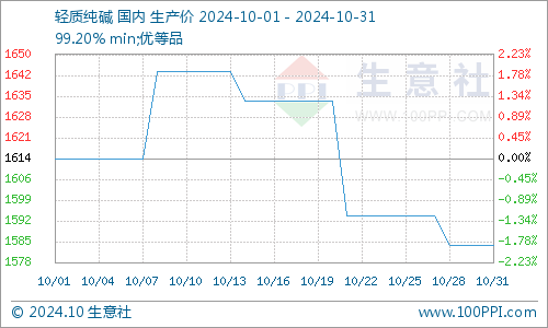 据生意社商品分析系统显示,本周轻质纯碱价格平稳。10月31日纯碱市场均价在1584元/吨,10月28日纯碱价格在1584元/吨,周内价格持稳,较月初价格下调1.86%。