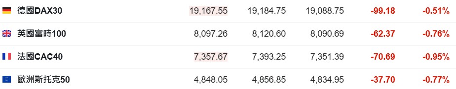 2. 截至发稿,德国DAX指数跌0.51%,英国富时100指数跌0.76%,法国CAC40指数跌0.95%,欧洲斯托克50指数跌0.77%。