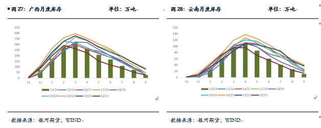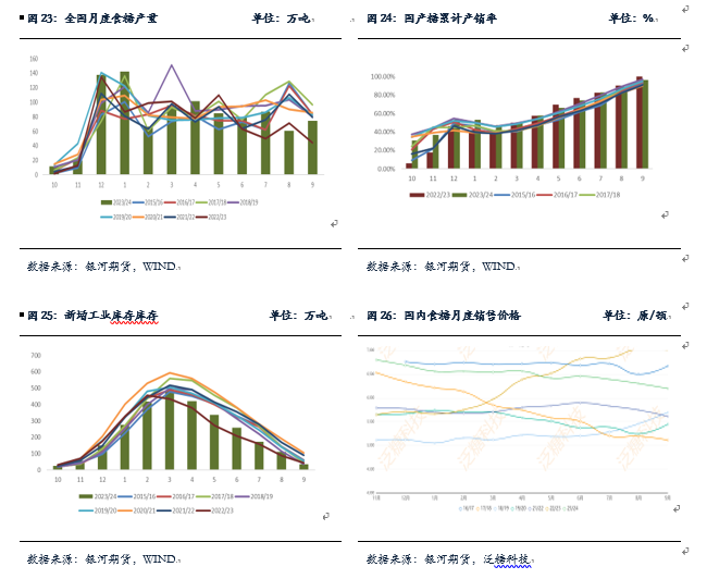 目前北方甜菜糖正处于压榨期,预计内蒙&新疆甜菜糖增产40万吨左右,云南糖增产15万吨左右,海南及广东地区受台风影响、产量或下滑10万吨左右。综上,全国24/25榨季食糖产量预计增加100-120万吨至1100-1120万吨。