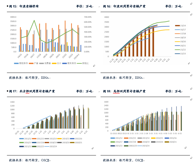 新榨季甘蔗&食糖产量与天气情况方面,季风的到来带动印度和泰国的降雨量有所增加,对新榨季甘蔗生长有一定促进作用。印度气象办公室表示,预计印度2024年6-9月的季风降雨水平将为长期均值的106%(2023年6-9月季风降雨量比平均水平低6%左右),但东北部地区降雨可能低于正常水平,该情况或将影响新榨季甘蔗的产量。除此以外,印度继续推行乙醇E20目标,新榨季甘蔗生产食糖和出口或将受此影响。