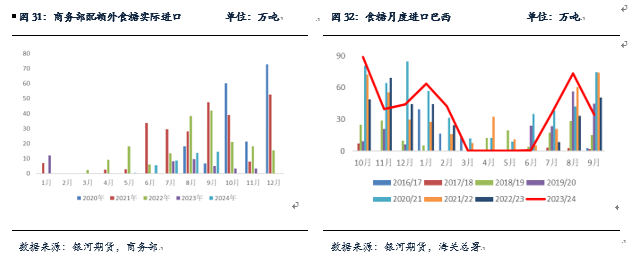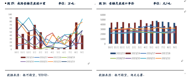 由于三季度末期原糖快速拉升,导致国内10月后食糖进口出现洗船现象,预计四季度国内食糖进口量低于市场预期,或将同比下降。9月份我国进口食糖40万吨,同比减少14万吨,在近十年当中处于第三低的水平,进口节奏有所放缓。其中白糖2.79万吨,原糖37.56万吨。2024年1-9月我国累计进口食糖289万吨,同比增加77万吨,继续保持在近十年当中第四高的水平。其中白糖20.32万吨,原糖268.16万吨。23/24榨季我国累计进口食糖475万吨,同比增加86万吨。
