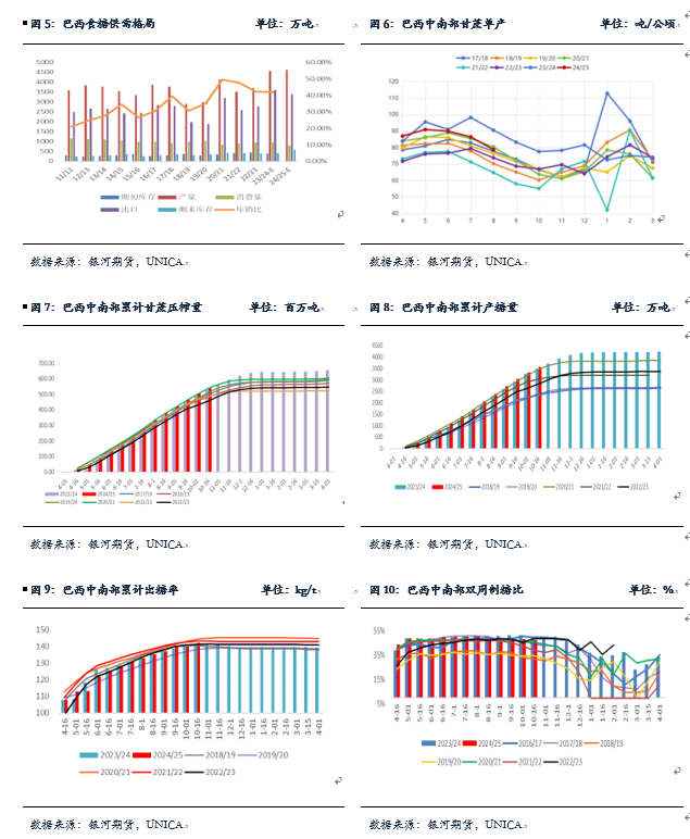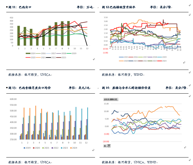 在全球糖市贸易供应聚焦巴西的背景下,巴西2024/25榨季初期受天气及降雨扰动的影响,甘蔗压榨量和糖产量不及市场预期,原糖价格受此扰动较大,巴西中南部阶段性生产数据仍是糖价的重要指引。8、9月甘蔗和糖产量均不及预期,在巴西天气问题带来的供应预期减少、单产下降,以及火灾对当季及下季甘蔗和糖产的不利影响。本榨季截至目前,巴西继续维持高出口预期,不过在低库存的背景下,预计随着压榨进入末期、出口量已将随之减少。北半球泰国增产预期较为强烈,印度还需关注出口政策的变化。