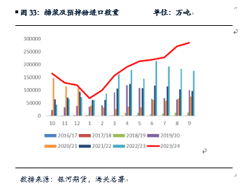 近三年糖浆及预拌粉进口数据一直呈现同比增长趋势。2024年1-9月份累计进口173.26万吨,同比增长33.04万吨,增幅23.57%。2023/24榨季我国累计进口糖浆、白砂糖预混粉214.79万吨,同比增加56.18万吨,增幅35.42%。