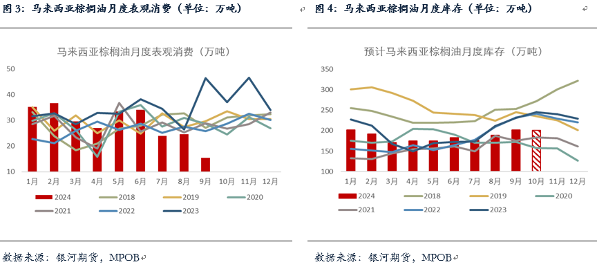 马棕9月期末库存累库超预期至201万吨,环比增加6.93%,其中产量减3.8%至182万吨,减幅略超市场预期;出口小幅增加0.93%至154万吨,超市场预期的-2%;消费减幅大超预期仅有15万吨,处于历史同期低位。9月马棕出现旺季减产,出口仍具韧性,但消费表现不佳,使得库存累库超预期,不过仍处于5年均线下,马棕供应仍不宽松。