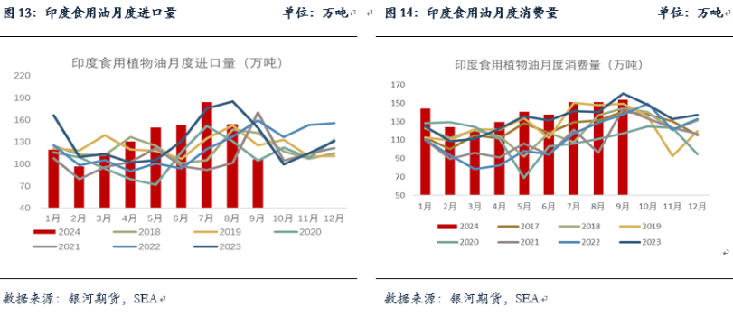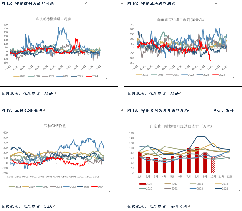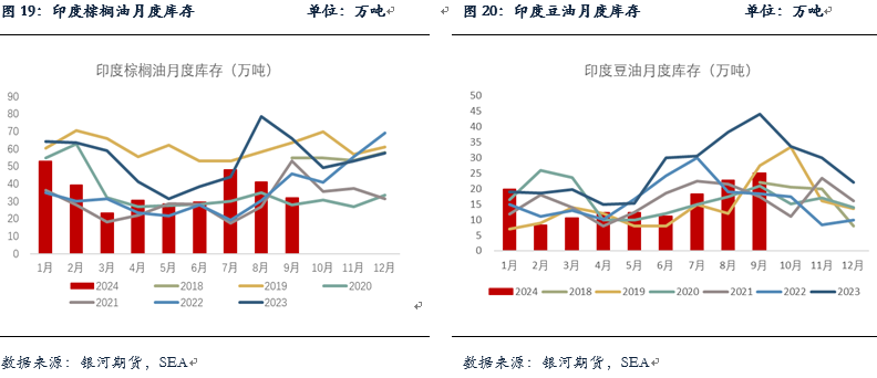 由于近期印度上调食用油进口税,而食用油国际价格也在快速上涨,使得印度在棕榈油以及豆油等食用油上的进口利润快速恶化。此前印度精炼商取消了10万吨10-12月交付的棕榈油采购订单,近期时常还存在洗船。10月底印度迎接排灯节假期,预计10月印度食用油进口量或将出现下降,与此同时港口库存将继续去库至历史同期偏低水平。