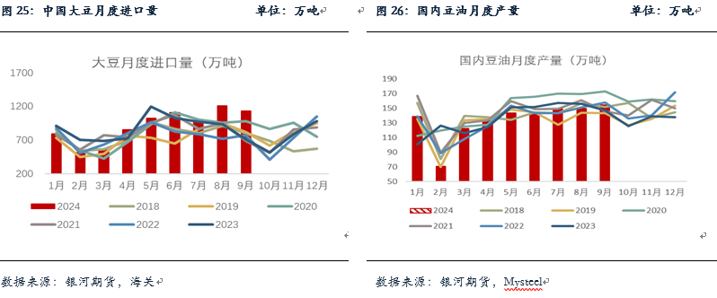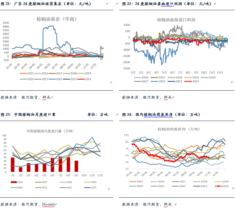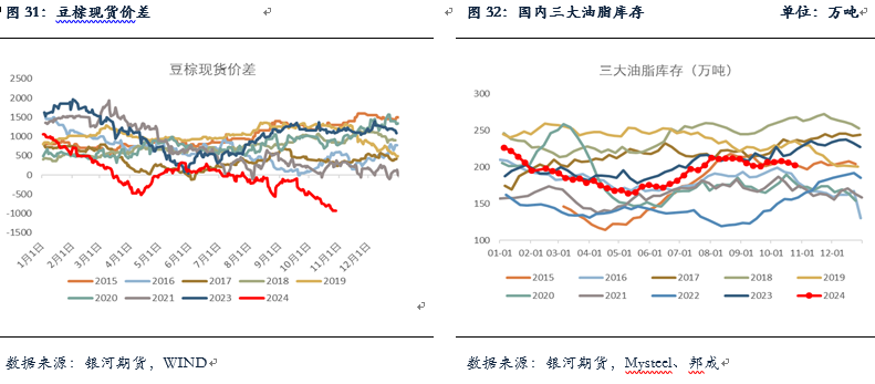 棕油进口方面,9月棕榈油进口在30万吨,环比减少约10万吨(-24%),今年1-9月棕油累计进口仅有272万吨,同比减少32%,也略低于22年的同期,持续处于偏低水平。买船方面,目前产地报价仍然较为坚挺,近远月报价均在1000美元以上,棕榈油近月进口利润倒挂加深约在-600以上,10月以来国内存在零星近月买船,但整体买船仍偏少,且存在外商回补的情况。预计10、11月棕油到港月均在25万吨左右,其中11月比10月到港多。截至2024年10月25日(第43周),全国重点地区棕榈油商业库存49.01万吨,环比上周减少2.58万吨,减幅5.00%,高价之下棕榈油现货成交持续偏低,提货一般,基差稳中有降,华南基差报在01+150。豆棕现货价差方面,豆棕现货价差大幅走缩,目前已经缩至1000附近的低位,短期这一局面或难出现快速转变,需要豆油有新的驱动。目前国内外棕榈油维持供应不宽松的状态,且棕油即将进入减产季,棕榈油较强的基本面对盘面存在支撑,市场做多棕榈油的情绪较为浓重,回调幅度比较有限。另外地缘及宏观方面的反复也会对油脂盘面存在较大扰动,短期棕榈油或仍维持高位震荡的格局,但中期我们对棕榈油仍维持震荡偏强观点。
