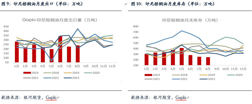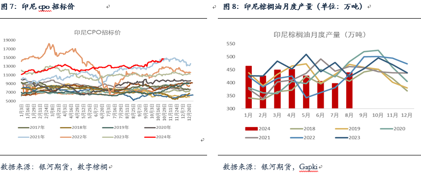 印尼方面,GAPKI数据显示印棕8月产量恢复较为明显,从7月的396万吨增到438万吨,出口有所增加但仍保持低位,从7月的224万吨升至238万吨,国内消费量从7月的203万吨增至206万吨,由于国内消费较为强劲,月末库存继续去库至245万吨的低位。目前印尼果串价格以及CPO招标价仍维持上涨趋势,基本接近甚至超过21年同期的高价。