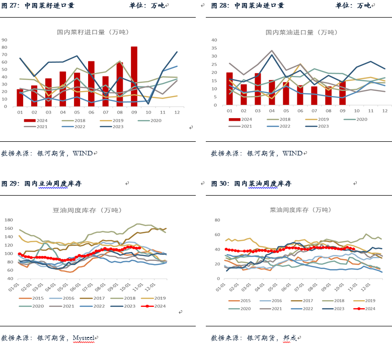 菜籽压榨方面,9月菜籽进口达到81万吨的高位,环比增加36%。今年1-9月菜油累计压榨产量达到160万吨,处于历史同期偏高,但仍低于去年同期。进口及买船方面,9月菜油进口14.6万吨,略高于8月,1-9月累计进口131万吨,亦低于去年同期。近期受中国对加菜籽进行反倾销审查,国内远月菜籽洗船较多,但近月菜籽预计到港在40-50万吨,菜油供应仍然充足。截至2024年10月25日,菜油库存40.55万吨,环比前一周减少1万吨,减幅2.4%,去库速度较慢,处于历史同期较为偏高水平。菜油基差维持低位震荡,广西三菜基差报至01-130。从基本面上看,国内菜油供应充足,需求一般,基本面较为偏弱,但由于反倾销事件的存在使得不确定性增加,对于菜油盘面形成一定的支撑,菜油短期上有压力下有支撑的格局延续,维持高位宽幅震荡。