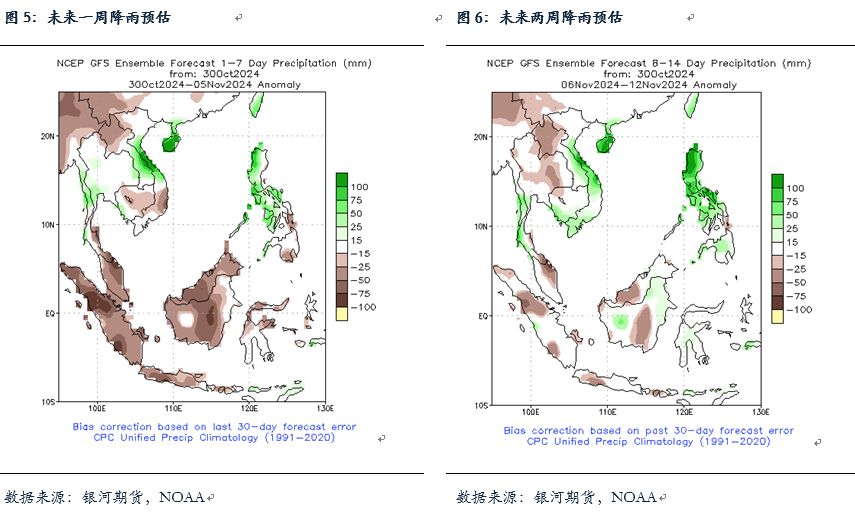 对于10月马棕产量及出口,MPOA和UOB对于10月前20日马棕产量的预估减幅较小,基本在1%附近,而SPPOMA预计减幅在6%。按照降雨预估图来看,未来一周产地预计将出现明显的干旱,而高频数据预测的10月马棕产量减幅后期有望继续收窄,我们预计10月马棕产量或继续维持在180万吨附近。出口方面,ITS数据显示10月前25日马棕出口增10.8%至132万吨,较前20日的增8.7%增幅有所上涨,其中出口到欧盟和印度的棕榈油增幅较为明显,尤其是印度,10月马棕出口仍然表现较好。整体上,我们预计10月马棕库存与9月相比变动不会很大,目前马棕虽处于最后一个增产月,但预计增产幅度较为有限。