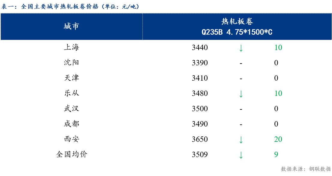 今日热轧板卷全国主要城市价格稳中趋弱,截止发稿时4.75热轧板卷全国均价3509元/吨,较上一交易日下跌9元/吨。今日黑色商品期货价格震荡下行,01合约收跌0.34%。