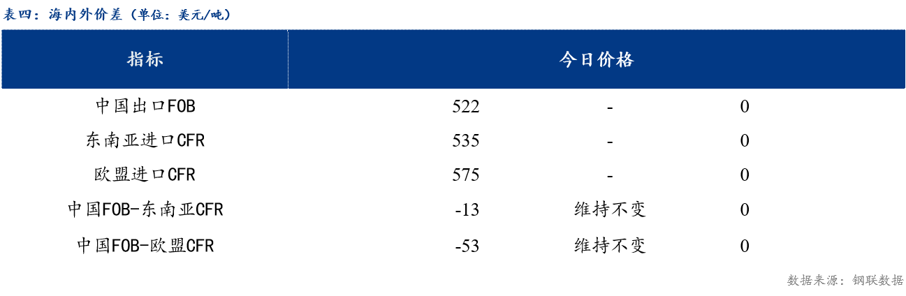 从区域价差来看,华东与东北价差50元/吨,较上一交易日正向缩小10元/吨;华东与华南价差-40元/吨,较上一交易日维持不变;华南与华北价差70元/吨,较上一交易日正向缩小10元/吨。